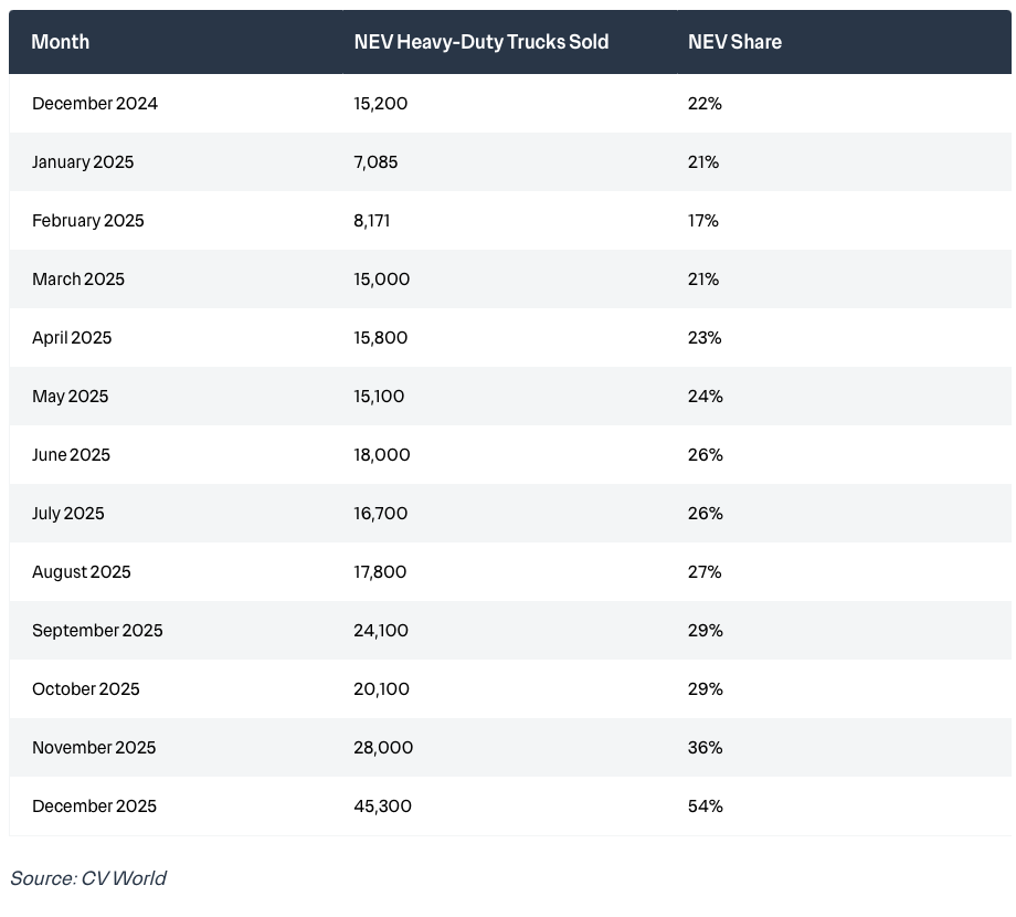 En décembre 2025, pas moins de 45 300 camions lourds électrifiés ont été immatriculés en Chine. Cela représente 54 % des ventes totales pour ce segment durant le mois — une première historique.