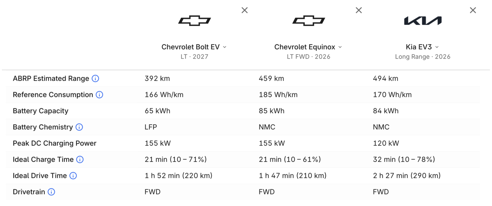 Dans le tableau, on voit que l’autonomie estimée par ABRP est beaucoup plus grande pour le KIA EV3, à 494 km, que pour le Chevrolet Equinox EV, à 459 km ou le Chevrolet Bolt, à 392 km. Tous ces chiffres sont différents de ceux utilisés lors de l’homologation des véhicules et représentent l’estimé selon ABRP de l’autonomie réelle.