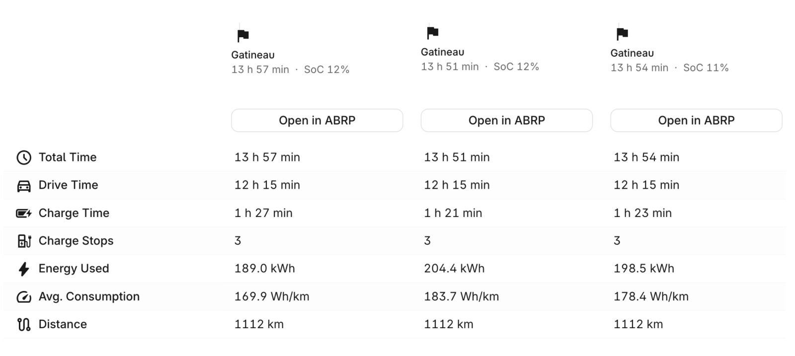 C’est justement pour aider à décider que l’outil de ABetterRoutePlanner prend toute son importance. Il permet d’ajouter jusqu’à 3 véhicules différents et de comparer leur temps de trajet entre 2 destinations de notre choix. Pour cet article, comparons les performances du Chevrolet Bolt à celle de l’Equinox EV et du Kia EV3 qui vient tout juste d’être annoncé pour le Canada. Afin de bien comprendre les différences entre chaque modèle, planifions un très long voyage entre Gaspé et Gatineau. Voici les résultats affichés par l’outil: